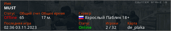 Играет на Counter Strike 1.6 сервере. Страна: РоссияПервый раз замечен 01:45 03.11.2023
