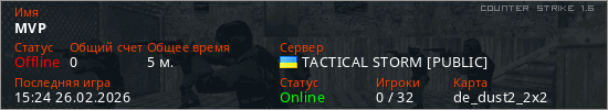 Играет на Counter Strike 1.6 сервере. Страна: УкраинаПервый раз замечен 15:22 26.02.2026