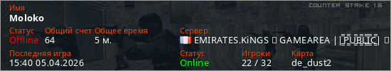 Последний раз был в сети 15:40 05.04.2026 Игрок с таким ником замечен на 14 серверах