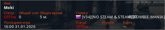 Играет на Counter Strike Source сервере. Страна: РоссияПервый раз замечен 15:58 31.01.2026