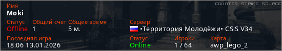 Играет на Counter Strike Source сервере. Страна: РоссияПервый раз замечен 17:54 13.01.2026