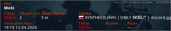 Играет на Counter Strike Global Offensive сервере. Страна: РоссияПервый раз замечен 19:09 12.04.2026