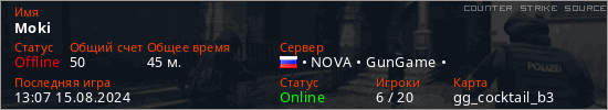 Играет на Counter Strike Source сервере. Страна: РоссияПервый раз замечен 18:53 26.08.2022
