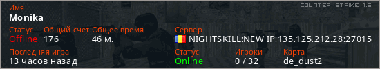 Играет на Counter Strike 1.6 сервере. Страна: РумынияПервый раз замечен 04:57 22.02.2026