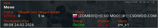 Играет на Counter Strike 1.6 сервере. Страна: РоссияПервый раз замечен 09:05 24.02.2026