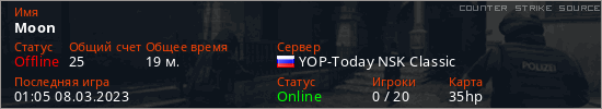 Играет на Counter Strike Source сервере. Страна: РоссияПервый раз замечен 00:48 08.03.2023