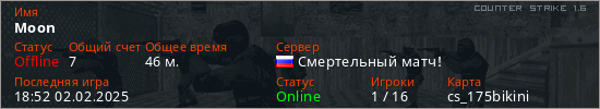 Играет на Counter Strike 1.6 сервере. Страна: РоссияПервый раз замечен 15:14 20.06.2024