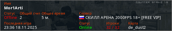 Играет на Counter Strike 1.6 сервере. Страна: РоссияПервый раз замечен 23:28 18.11.2025
