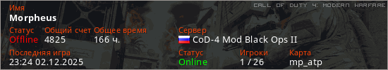 Играет на Call of Duty 4: Modern Warfare сервере. Страна: РоссияПервый раз замечен 22:15 06.11.2023