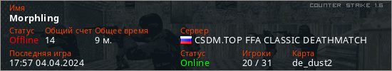 Играет на Counter Strike 1.6 сервере. Страна: РоссияПервый раз замечен 17:44 04.04.2024