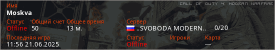 Играет на Call of Duty 4: Modern Warfare сервере. Страна: РоссияПервый раз замечен 15:14 08.04.2025