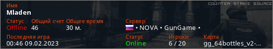 Играет на Counter Strike Source сервере. Страна: РоссияПервый раз замечен 00:18 09.02.2023