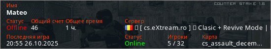 Играет на Counter Strike 1.6 сервере. Страна: РумынияПервый раз замечен 02:20 02.01.2025