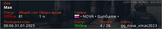 Играет на Counter Strike Source сервере. Страна: РоссияПервый раз замечен 18:41 06.02.2023