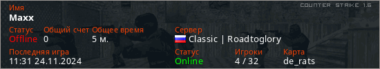 Играет на Counter Strike 1.6 сервере. Страна: РоссияПервый раз замечен 11:29 24.11.2024
