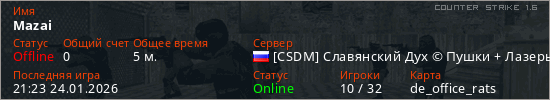 Играет на Counter Strike 1.6 сервере. Страна: РоссияПервый раз замечен 21:02 24.01.2026