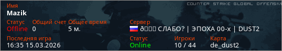 Играет на Counter Strike Global Offensive сервере. Страна: РоссияПервый раз замечен 16:33 15.03.2026