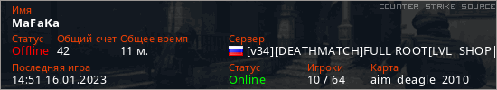 Играет на Counter Strike Source сервере. Страна: РоссияПервый раз замечен 14:43 16.01.2023