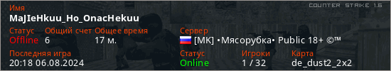 Играет на Counter Strike 1.6 сервере. Страна: РоссияПервый раз замечен 23:54 11.05.2023