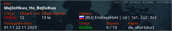 Играет на Counter Strike Global Offensive сервере. Страна: РоссияПервый раз замечен 18:02 21.11.2025