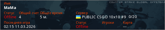 Играет на Counter Strike Global Offensive сервере. Страна: УкраинаПервый раз замечен 01:25 11.03.2026