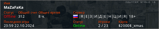 Играет на Counter Strike 1.6 сервере. Страна: РоссияПервый раз замечен 20:53 03.01.2020