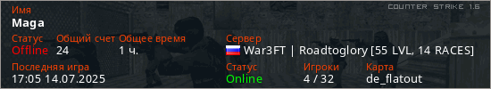 Играет на Counter Strike 1.6 сервере. Страна: РоссияПервый раз замечен 16:05 12.12.2021