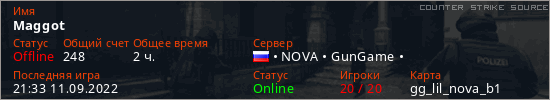 Играет на Counter Strike Source сервере. Страна: РоссияПервый раз замечен 16:01 04.09.2022