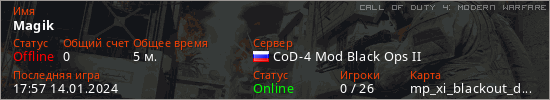 Играет на Call of Duty 4: Modern Warfare сервере. Страна: РоссияПервый раз замечен 17:11 14.01.2024