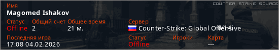 Играет на Counter Strike Source сервере. Страна: РоссияПервый раз замечен 21:17 04.01.2026