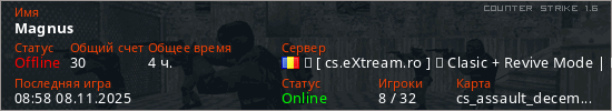 Играет на Counter Strike 1.6 сервере. Страна: РумынияПервый раз замечен 18:23 06.12.2024