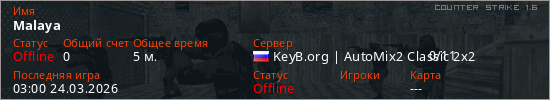 Играет на Counter Strike 1.6 сервере. Страна: РоссияПервый раз замечен 02:07 24.03.2026