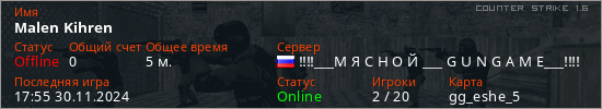 Играет на Counter Strike 1.6 сервере. Страна: РоссияПервый раз замечен 17:53 30.11.2024