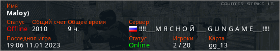 Играет на Counter Strike 1.6 сервере. Страна: РоссияПервый раз замечен 23:59 17.09.2022