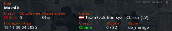 Играет на Counter Strike 1.6 сервере. Страна: ЛатвияПервый раз замечен 19:28 05.04.2025