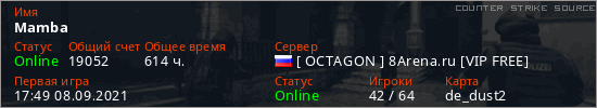Играет на Counter Strike Source сервере. Страна: РоссияПервый раз замечен 17:49 08.09.2021