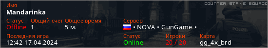 Играет на Counter Strike Source сервере. Страна: РоссияПервый раз замечен 12:38 17.04.2024