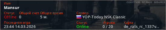Играет на Counter Strike Source сервере. Страна: РоссияПервый раз замечен 23:42 14.03.2026
