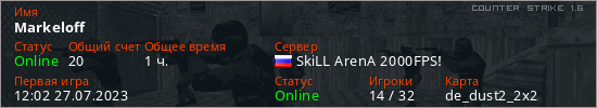 Играет на Counter Strike 1.6 сервере. Страна: РоссияПервый раз замечен 12:02 27.07.2023