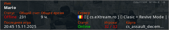 Играет на Counter Strike 1.6 сервере. Страна: РумынияПервый раз замечен 23:30 28.10.2024