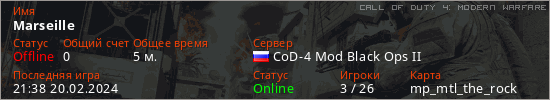 Играет на Call of Duty 4: Modern Warfare сервере. Страна: РоссияПервый раз замечен 21:30 20.02.2024