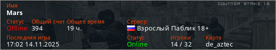 Играет на Counter Strike 1.6 сервере. Страна: РоссияПервый раз замечен 17:24 12.11.2019