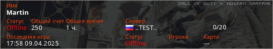 Играет на Call of Duty 4: Modern Warfare сервере. Страна: РоссияПервый раз замечен 11:56 21.02.2025