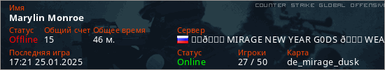 Играет на Counter Strike Global Offensive сервере. Страна: РоссияПервый раз замечен 22:00 18.12.2024