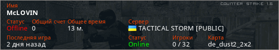 Играет на Counter Strike 1.6 сервере. Страна: УкраинаПервый раз замечен 00:18 14.03.2026