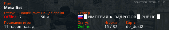 Играет на Counter Strike 1.6 сервере. Страна: РоссияПервый раз замечен 01:14 16.03.2026