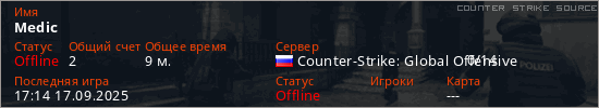 Играет на Counter Strike Source сервере. Страна: РоссияПервый раз замечен 13:19 07.09.2025