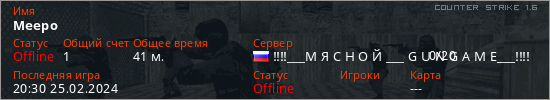 Играет на Counter Strike 1.6 сервере. Страна: РоссияПервый раз замечен 19:41 25.02.2024