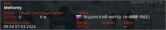 Играет на Counter Strike 1.6 сервере. Страна: РоссияПервый раз замечен 09:25 07.03.2026