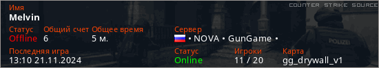 Играет на Counter Strike Source сервере. Страна: РоссияПервый раз замечен 13:08 21.11.2024